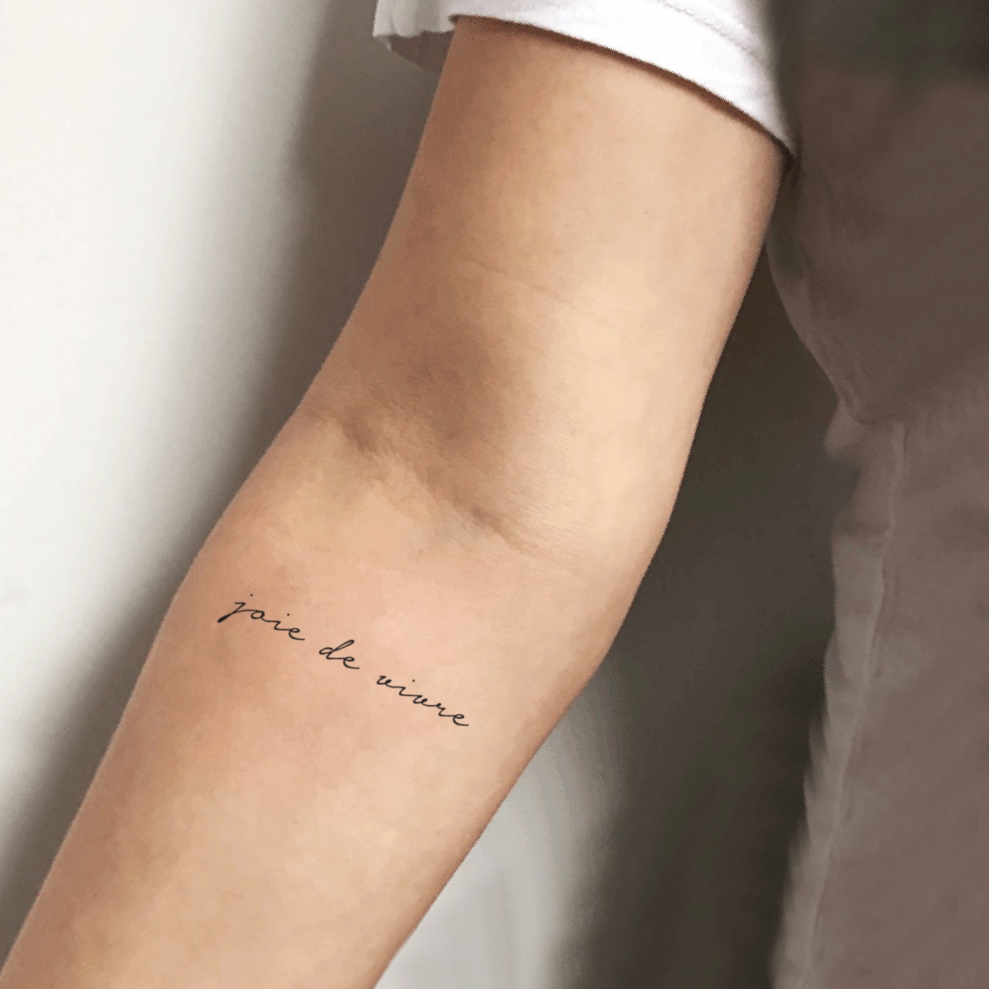 Fine Tattoo Work Joie De Vivre Done By Alvin Orange Ca United State Tattoo Schrift Handgelenk Tattoo Unterarm Frau Schriftzug Tattoo Schriftzuge Ideen